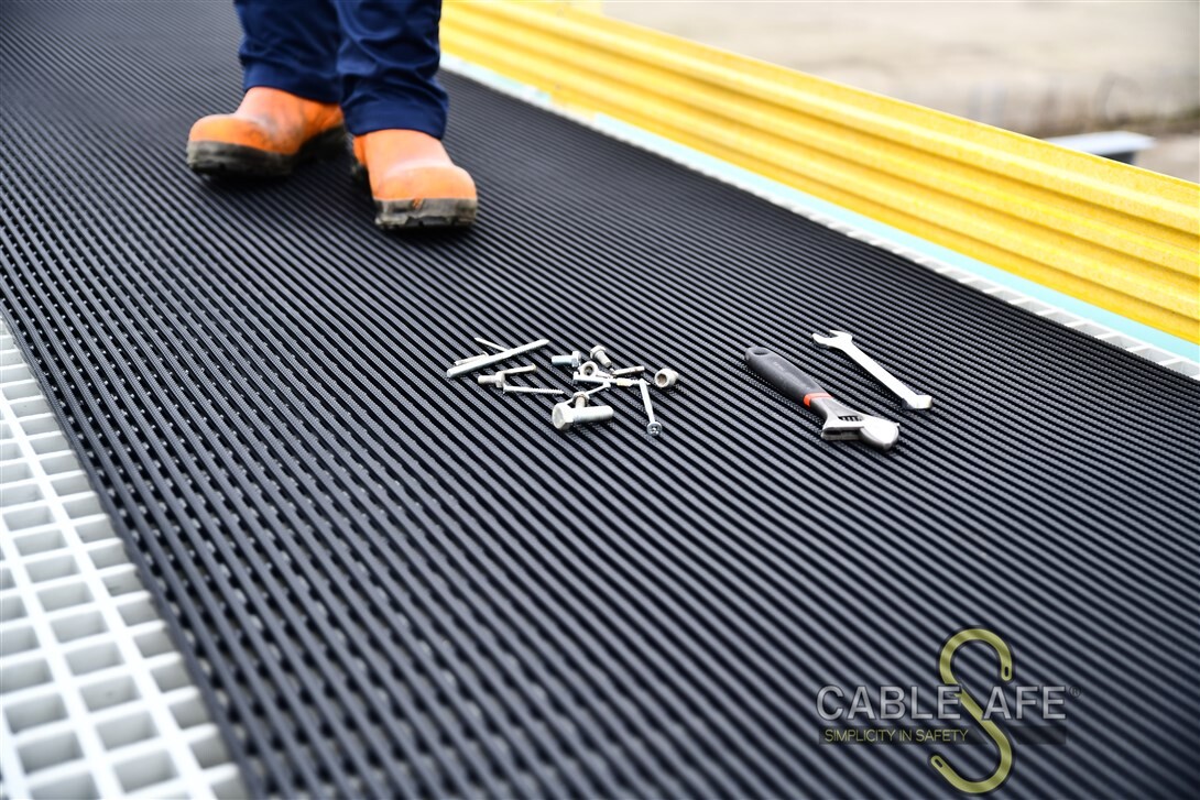 CableSafe ofrece esteras antideslizantes y resistentes a aceites, grasas, ácidos y álcalis. Puede estar seguro de que sus trabajadores estarán a salvo de resbalones, tropiezos y caídas, así como de la caída de objetos, si instala alfombras antideslizantes. Esteras antideslizantes y resistentes perfectas para lugares de trabajo comerciales e industriales. Dropped Objects Prevention Walkway es una resistente alfombra antideslizante diseñada para evitar que los objetos caigan a través de las rejillas. El dibujo de diamante de la alfombrilla proporciona una tracción superior bajo los pies, lo que no sólo ayuda a reducir el riesgo de que las personas resbalen, sino que también contribuye a evitar la caída de equipos. Si trabaja en altura, no cabe duda de que necesita seguridad en los pasillos frente a la caída de objetos.