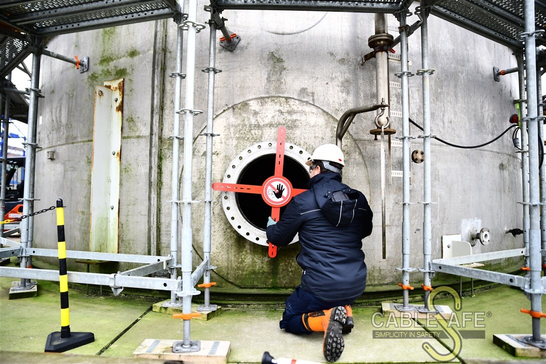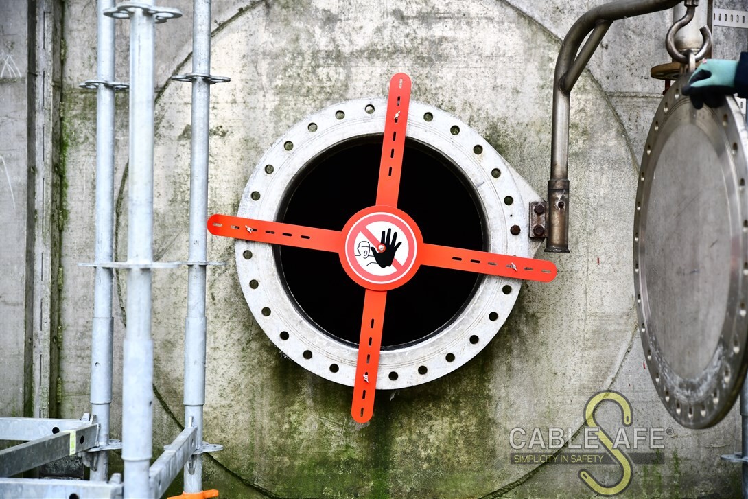 La barrera para espacios confinados de gran resistencia y rápida adaptación también está disponible con un sistema de bloqueo y etiquetado. Este sistema de bloqueo y etiquetado se instala a través de los brazos de la barrera para espacios confinados adaptable rápidamente de alta resistencia y fija la barrera para espacios confinados a la abertura de la boca de acceso con un cable de acero de 3,6 metros. Un sólido cierre garantiza que la barrera para espacios confinados de alta resistencia y rápida adaptación se mantenga en su sitio y no se manipule mientras la abertura de la arqueta esté temporalmente abierta. No se permite la entrada a nadie y eso es visible y muy claro. Este sistema evitará accidentes mortales por entrada accidental durante los trabajos de mantenimiento e instalación.