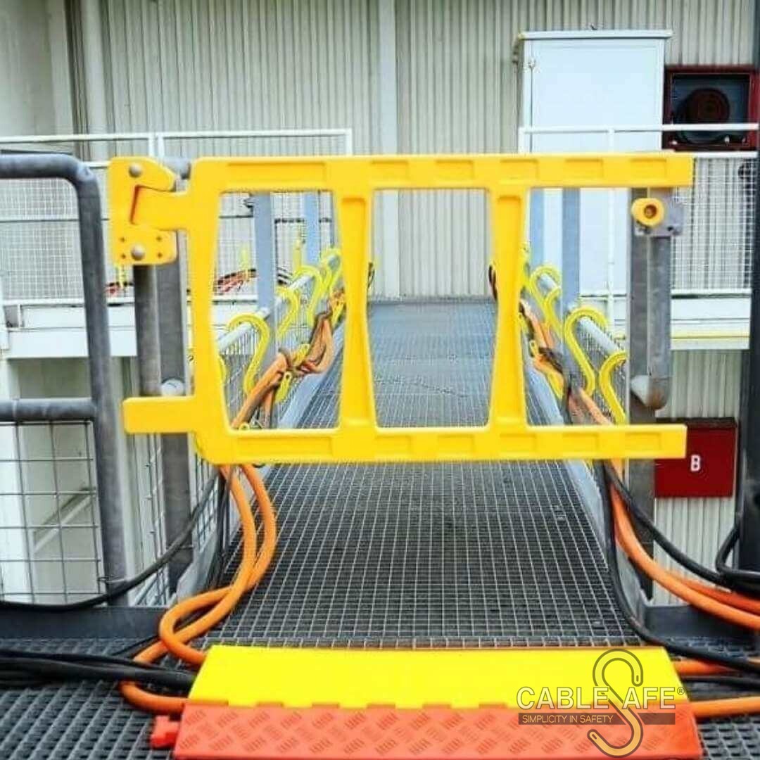 Las puertas de seguridad de cierre automático CableSafe han sido probadas por TÜV. CableSafe - Gravity auto close / shut safety gates es conforme a la norma de la Organización Internacional de Normalización - ISO 14122-3:2001 [sección: 3.2.5 puerta de cierre automático parte de la barandilla que está destinado a ser abierto fácilmente. Cuando se suelta la barrera, ésta se cierra automáticamente utilizando, por ejemplo, el efecto de la gravedad o de un muelle] ATENCIÓN: Los antiguos mecanismos de barrera abatibles pueden convertirse en objetos que se caen. Las puertas de cierre automático, como las puertas de seguridad industrial de cierre automático CableSafe, eliminan este riesgo y se recomiendan siempre que sea posible.